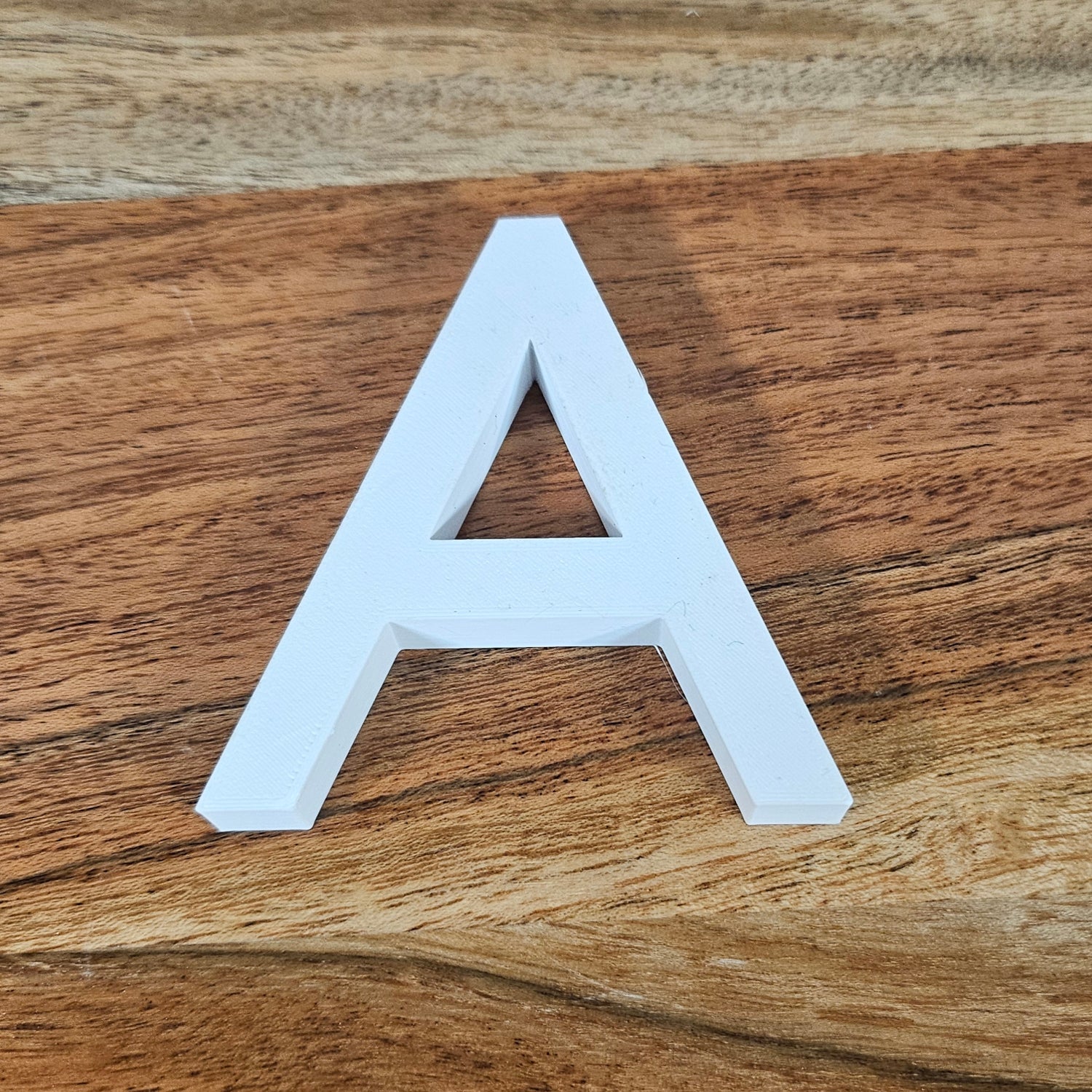 Die Buchstaben sind stabil, leicht und haben sichtbare Kanten – man erkennt den echten 3D-Druck.