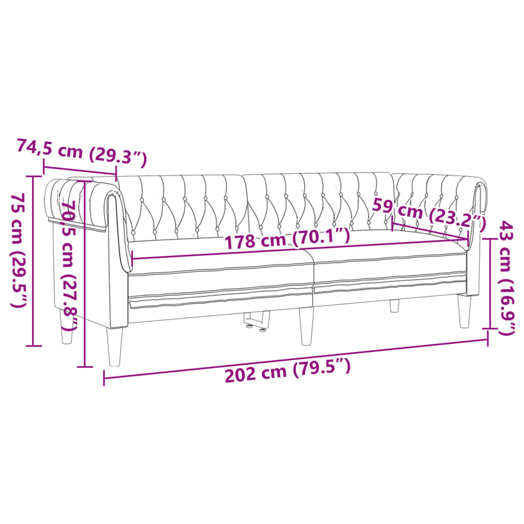 Ce canapé Chesterfield 3 places est idéal pour discuter, lire, regarder la télévision ou simplement se détendre. Il deviendra un véritable élément central de votre intérieur. Doux et résistant : le tissu présente un aspect simple et épuré, tout en étant respirant et résistant. Assise confortable : le canapé est très confortable grâce à son assise, ses accoudoirs et son dossier épais. Style Chesterfield : avec son design classique, ses accoudoirs roulés et son dossier profond, ce canapé sublime tout espace de vie et allie style et confort. Pieds de soutien : le fauteuil rembourré est soutenu par des pieds robustes qui assurent sa stabilité.