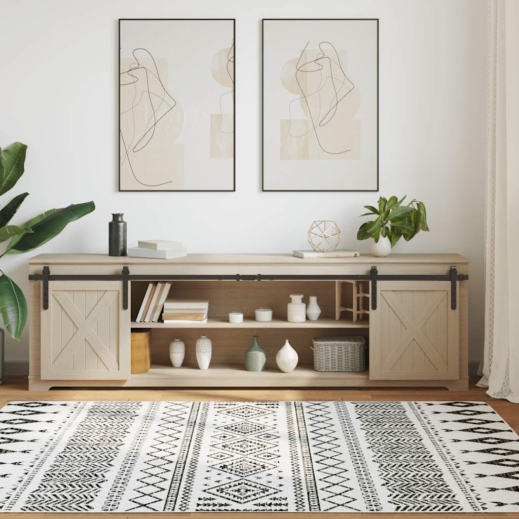 Mit diesem Schiebetürbeschlag-Set lassen sich deine Schranktüren geräuschlos und mühelos öffnen und schließen.Langlebiges Material: Der Schiebetürbeschlag besteht aus pulverbeschichtetem Kohlenstoffstahl, der robust, langlebig und strapazierfähig ist.Geräuschlos und leichtgängig: Dank der innenliegenden Lager gleiten deine Türen sanft und geräuschlos. Türstopper sind ebenfalls im Lieferumfang enthalten, um das Entgleisen der Rollen zu verhindern, während die Gummidichtungen den Stoß der Rollen dämpfen und das Geräusch reduzieren.Vielseitig einsetzbar: Dieses Set enthält 2 Gleitschienen (mit einer Gesamtlänge von 213 cm) und 2 verschleißfeste Rollen. Es ist für Schiebetüren mit einer Dicke von 22–25 mm bestimmt und lässt sich in Scheunen, Küchen, Arbeitszimmern usw. einsetzen.Zeitloses Design: Mit seinem kompakten, zeitlosen Design macht der Schiebetürbeschlag eine gute Figur in jeder Einrichtung.