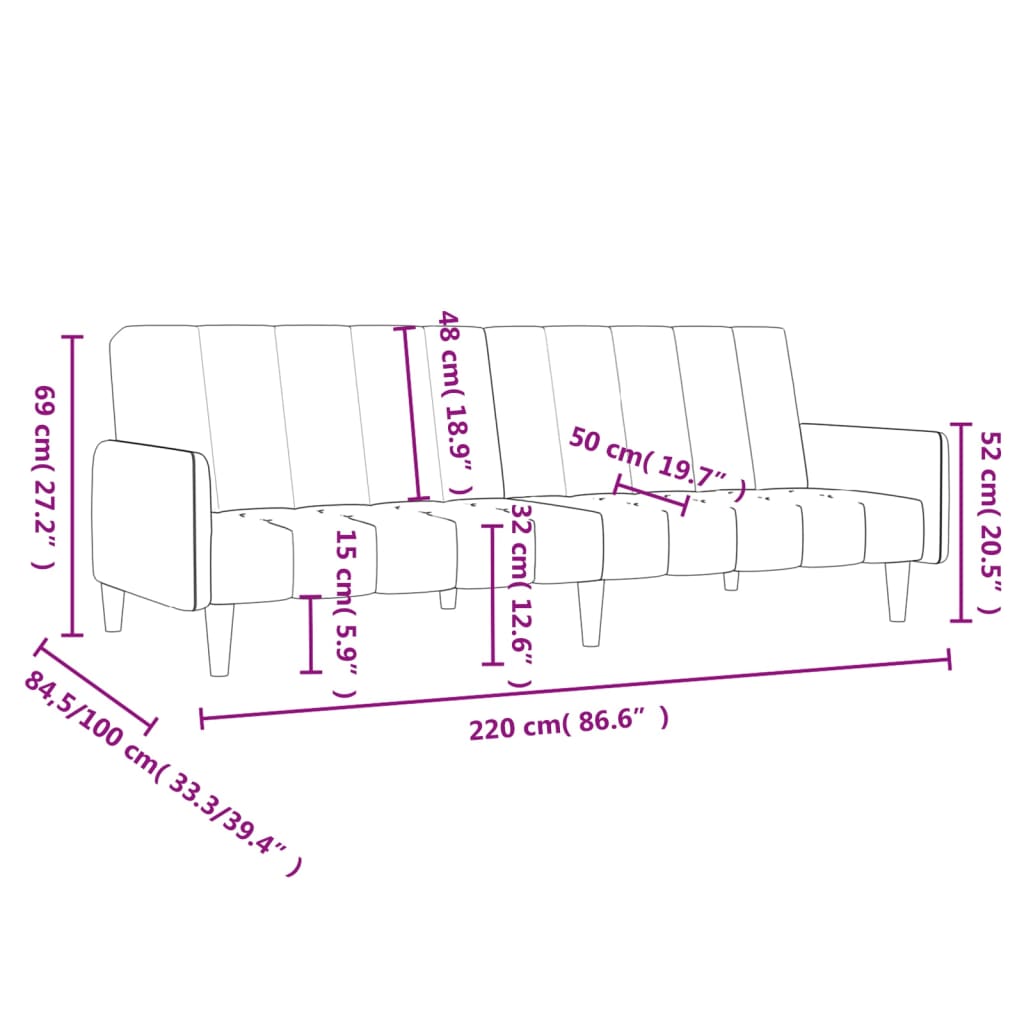 Ce canapé-lit est la solution idéale pour accueillir des invités et offrir un confort optimal pendant la journée. Fonction 2 en 1 : Ce canapé-lit se transforme rapidement et facilement en lit et inversement. Les deux dossiers séparés peuvent être partiellement ou entièrement abaissés pour créer un espace idéal pour une sieste ou un lit double. Assise confortable : Ce canapé-lit est recouvert de velours doux et confortable. Le velours est un tissu doux et luxueux caractérisé par son poil dense et lisse, composé de fibres uniformément coupées. Le velours est particulièrement doux et confortable. Structure robuste et stable : La structure en bois confère au canapé 2 places stabilité et robustesse. Polyvalent : Ce canapé-lit convient à divers espaces tels que les salons, les home cinémas, les sous-sols, les petites pièces, les chambres d'étudiants, les petits appartements, les studios et les bureaux. Il offre des moments inoubliables en famille et embellit n'importe quelle pièce.