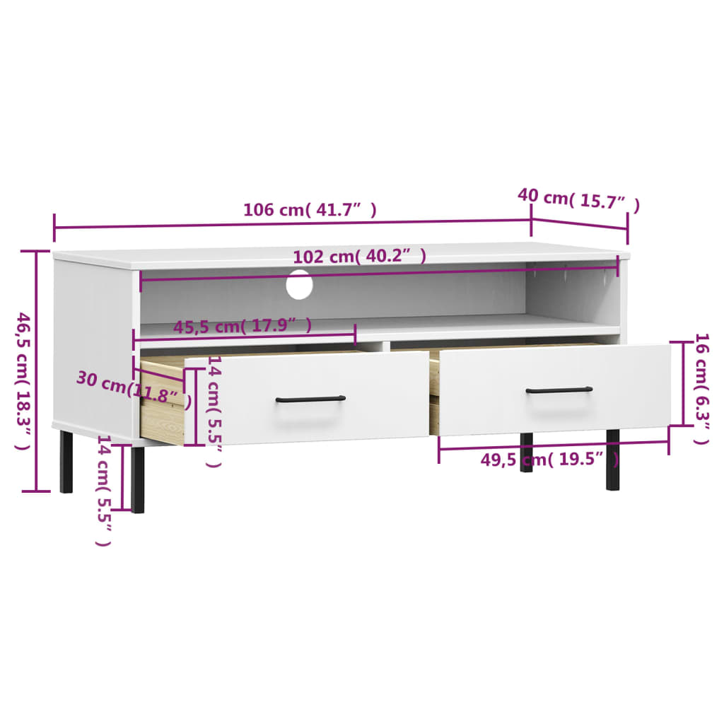Meuble TV OSLO avec pieds en métal en pin massif blanc