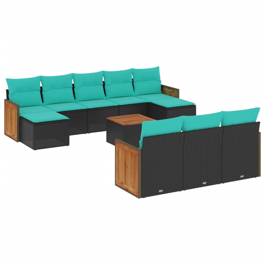 11-teiliges Gartensofa-Set mit Kissen, schwarzes Polyrattan