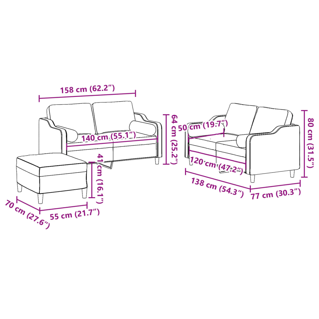 Diese Sofagarnitur bietet einen ausgezeichneten Platz zum Plaudern, Lesen, Fernsehen oder einfach nur zum Entspannen. Sie wird ein echter Blickfang in deinem Zuhause sein. Strapazierfähiger Stoff: Der Stoff zeichnet sich durch einen schlichten und sauberen Look aus und ist gleichzeitig atmungsaktiv und langlebig.Robustes und stabiles Gestell: Das Gestell aus Sperrholz und Metall verleiht der Sofagarnitur Robustheit und Stabilität. Bequemes Sitzerlebnis: Mit dick gepolsterten Sitzflächen, Armlehnen und Rückenkissen versehen, ist das Sofa sehr bequem. Praktische Rollkissen: Die Rollkissen werten nicht nur deine Einrichtung auf, sondern sorgen auch für zusätzlichen Sitz- oder Liegekomfort. Vielseitiger Fußhocker: Der Hocker eignet sich zum Ausruhen der Füße beim Liegen auf dem Sofa, kann aber auch als zusätzliche Sitzgelegenheit in deinem Zimmer dienen. Darüber hinaus eignet er sich durch sein schlichtes Design und seine kompakte Größe für fast alle Wohnräume.